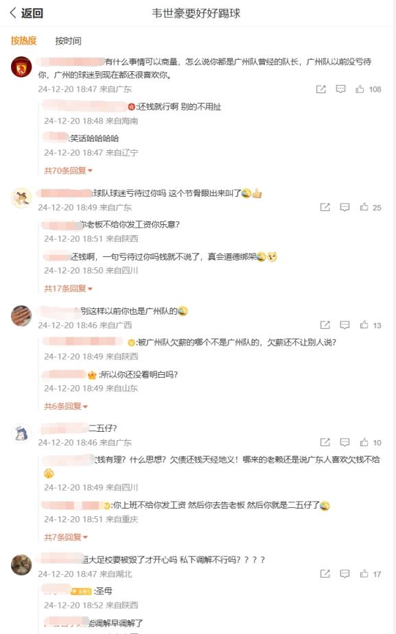 在韋世豪的微博評論區(qū)下充斥著兩種聲音,一種認(rèn)為韋世豪當(dāng)初也是廣州隊(duì)隊(duì)長,有什么事可以商量,另一種則認(rèn)為俱樂部欠債還錢天經(jīng)地義。你怎么看?